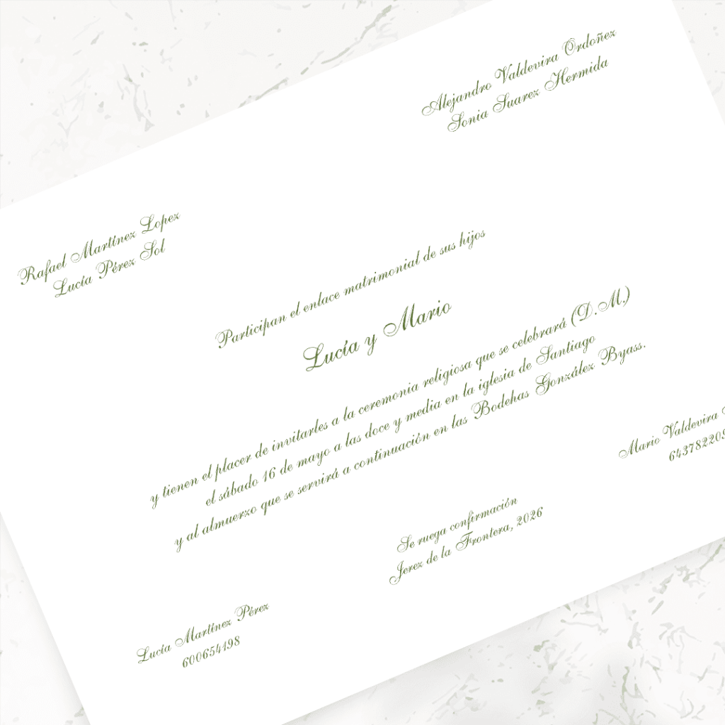 Puedes elegir entre varias opciones de sobre (en color marfil, en azul océano o en verde musgo) así como de tarjetón (en marfil o blanco).