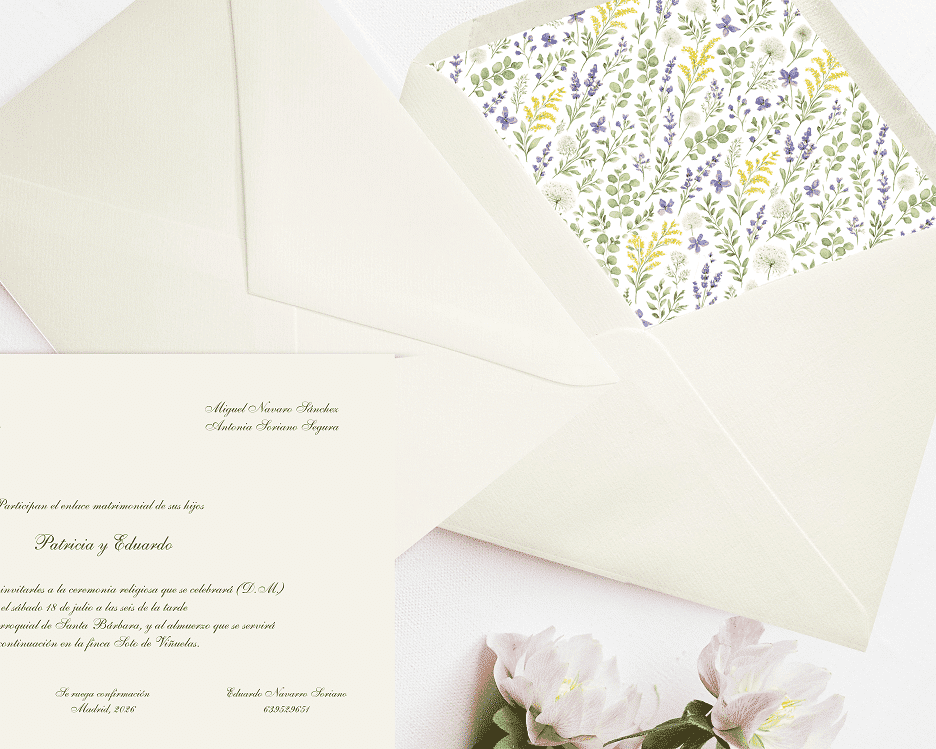 Si buscas un aire campestre, el modelo Silvestre con su forro de sobre lleno de pequeñas florecillas dará un toque especial a tus invitaciones de boda en papel.