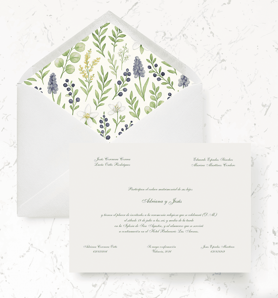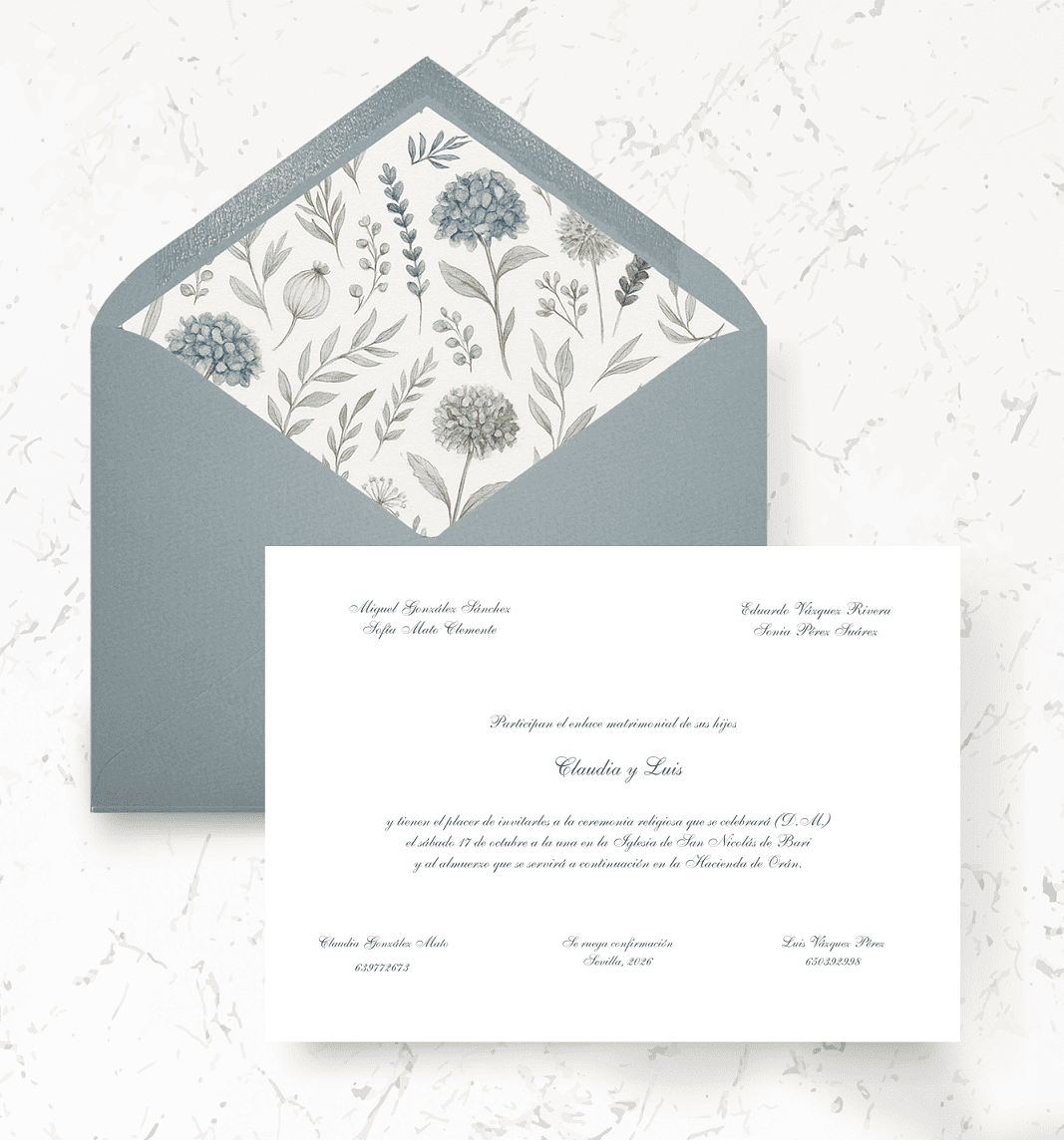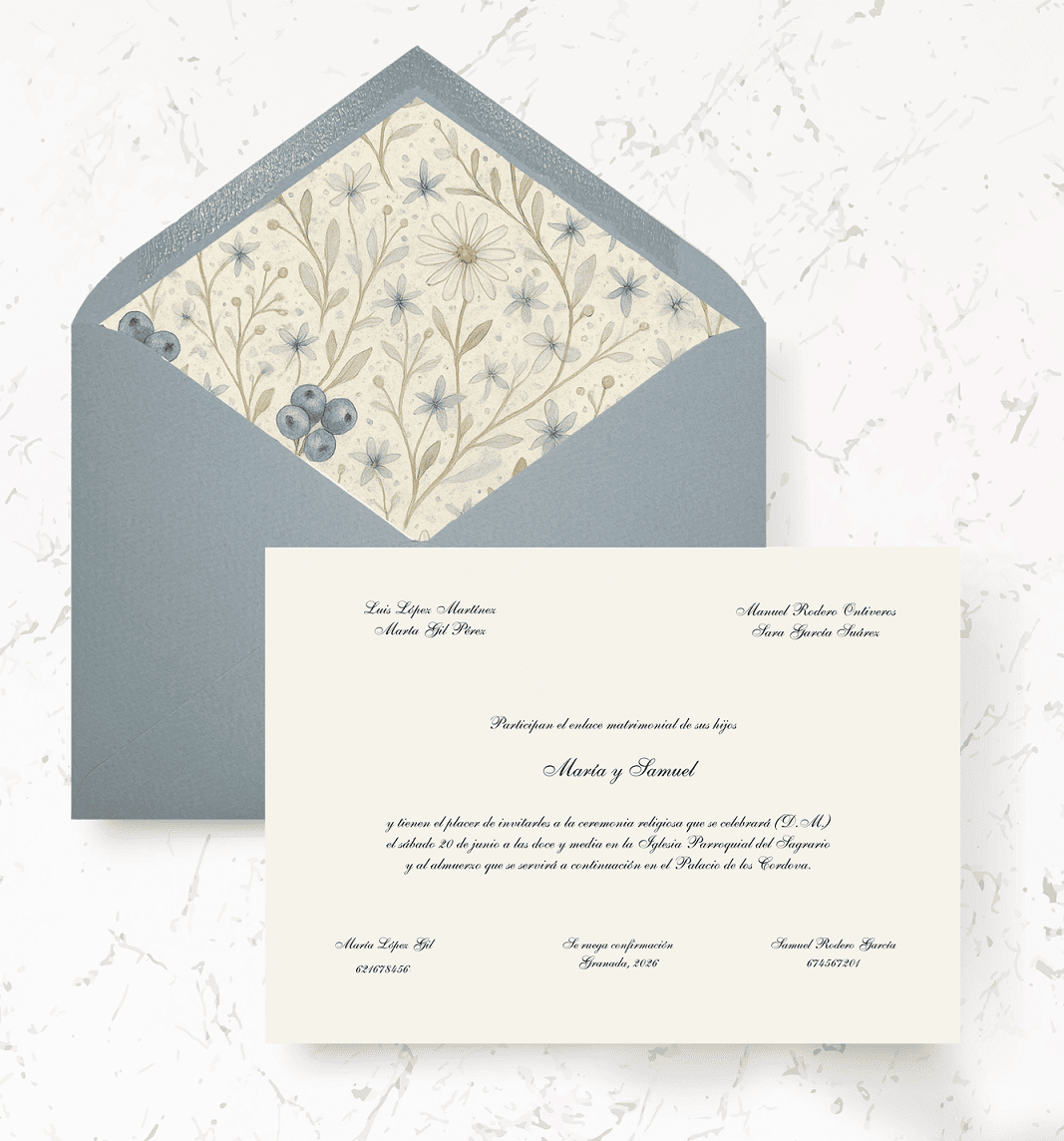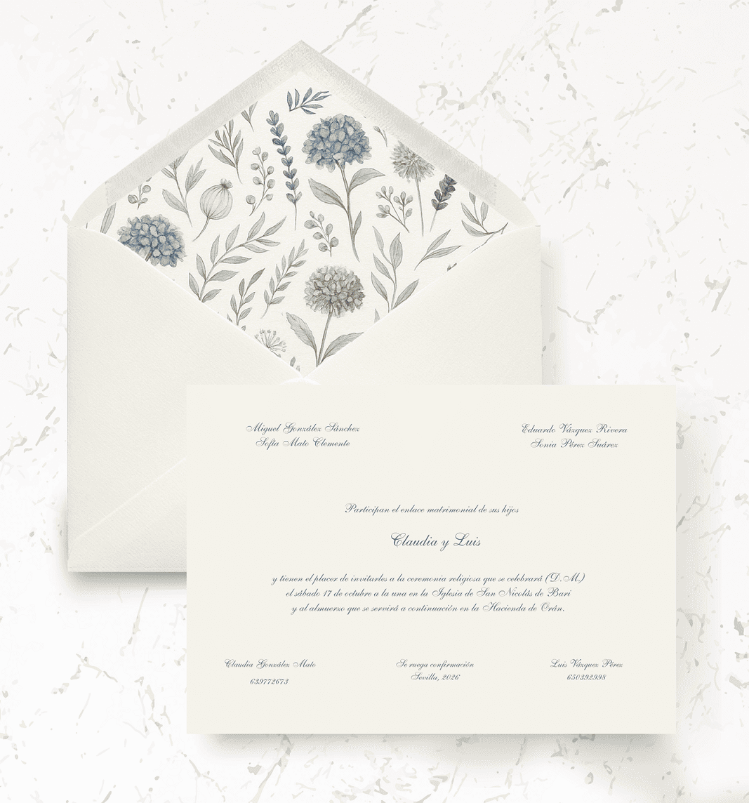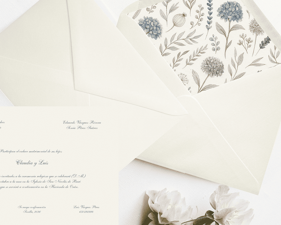 El lugar donde os casaréis también influye en el diseño de la invitación. No transmite lo mismo una boda junto al mar, con inspiración náutica y tonos suaves, que una celebración en un jardín rodeado de flores o en una finca con un aire rústico. Cada escenario tiene su propia magia, y queremos que vuestras invitaciones de boda en papel reflejen ese ambiente desde el primer vistazo. Por eso, trabajamos con vosotros para que cada detalle esté en sintonía con el lugar elegido.
