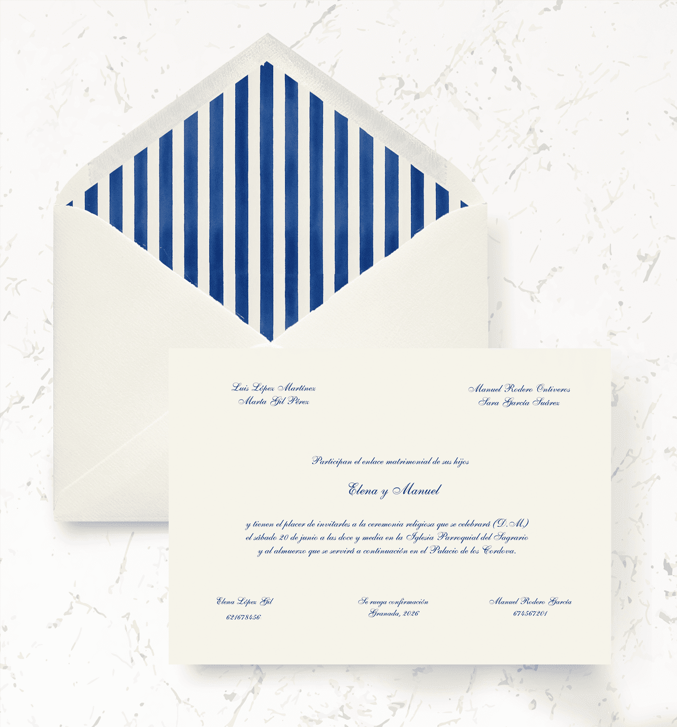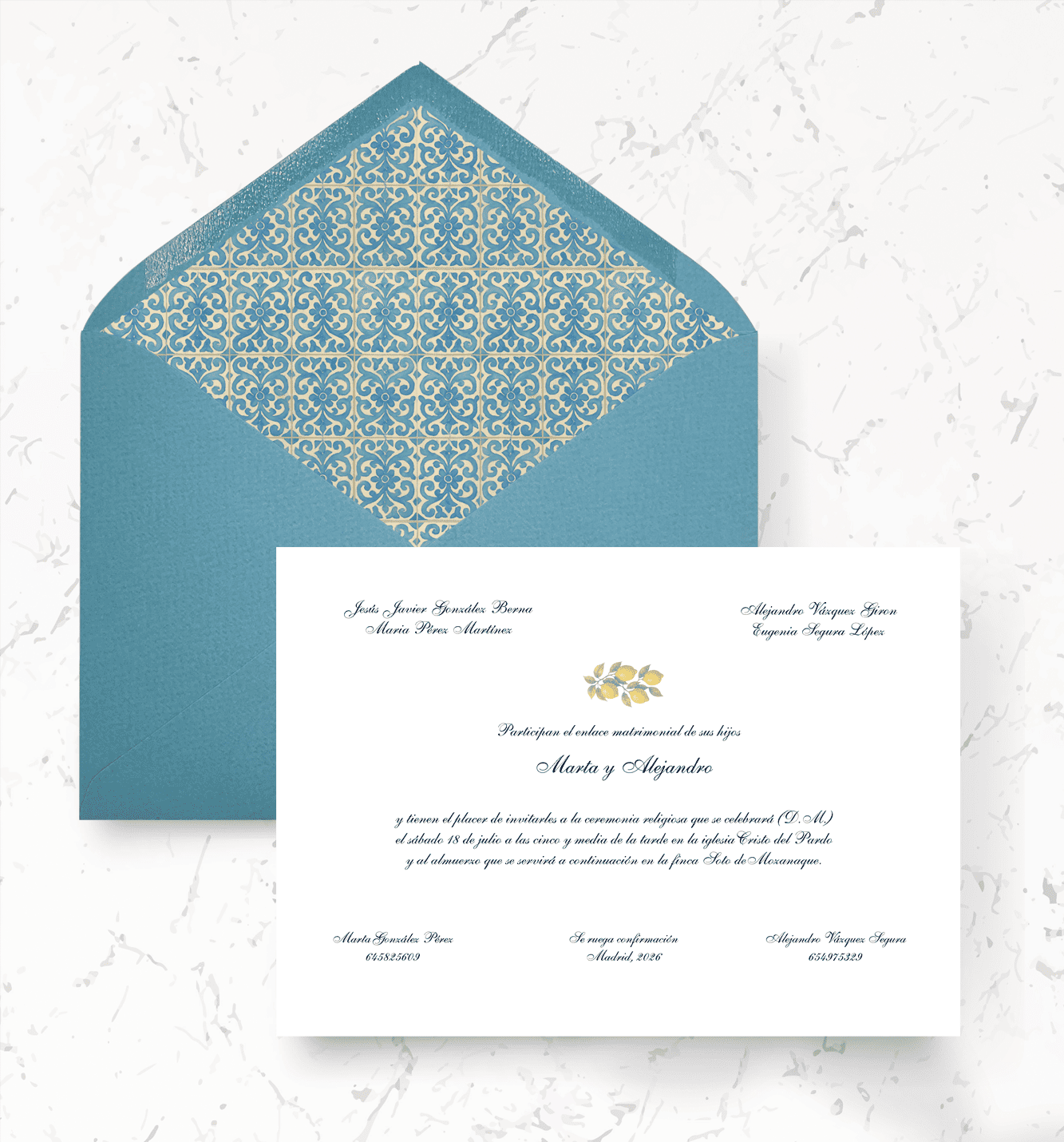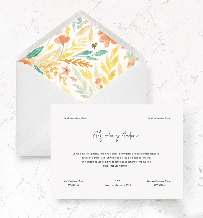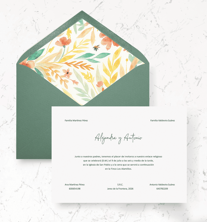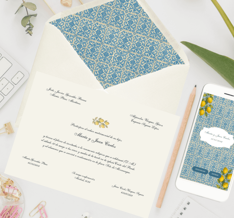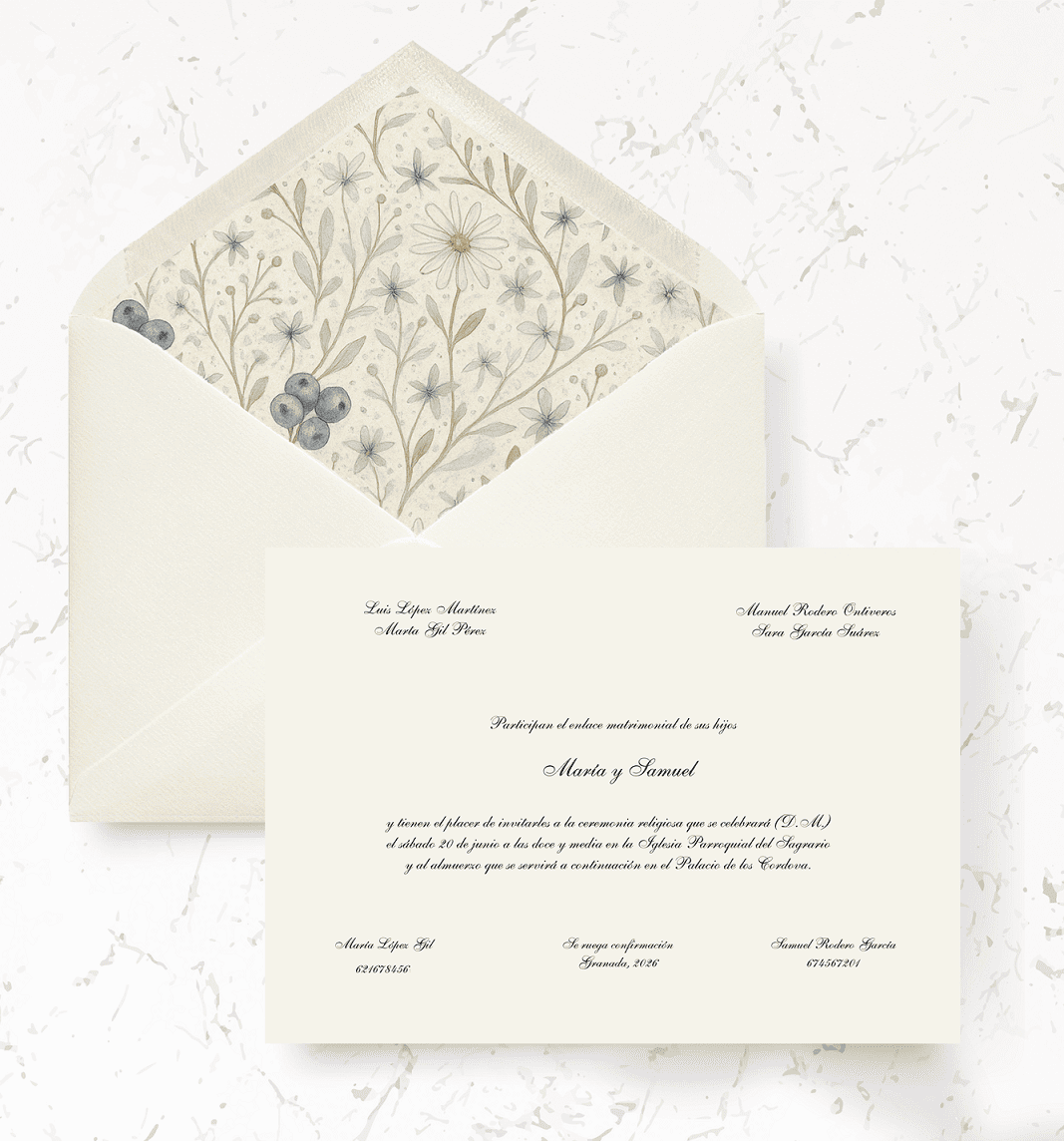 El lugar donde os casaréis también influye en el diseño de la invitación. No transmite lo mismo una boda junto al mar, con inspiración náutica y tonos suaves, que una celebración en un jardín rodeado de flores o en una finca con un aire rústico. Cada escenario tiene su propia magia, y queremos que vuestras invitaciones de boda en papel reflejen ese ambiente desde el primer vistazo. Por eso, trabajamos con vosotros para que cada detalle esté en sintonía con el lugar elegido.