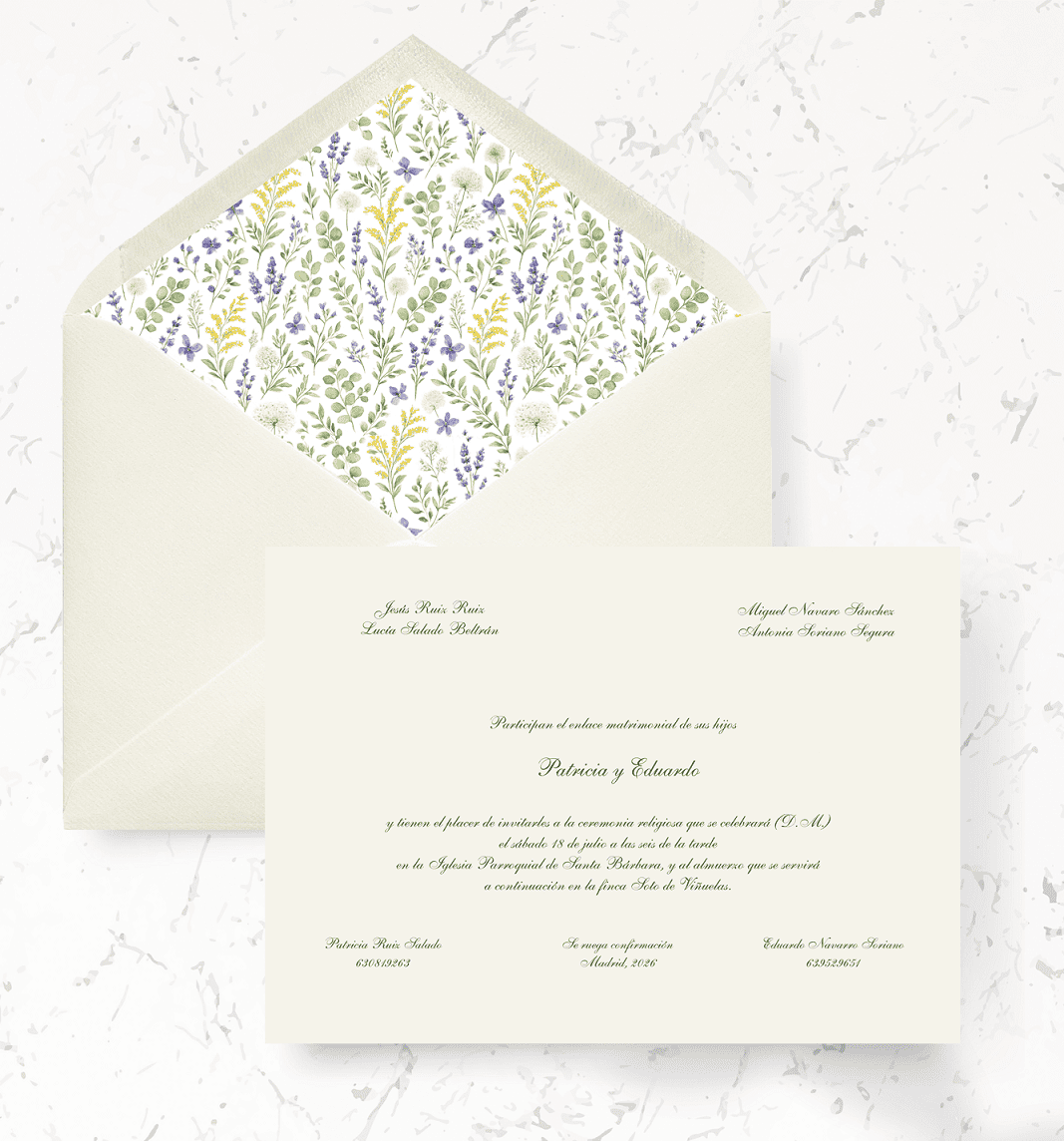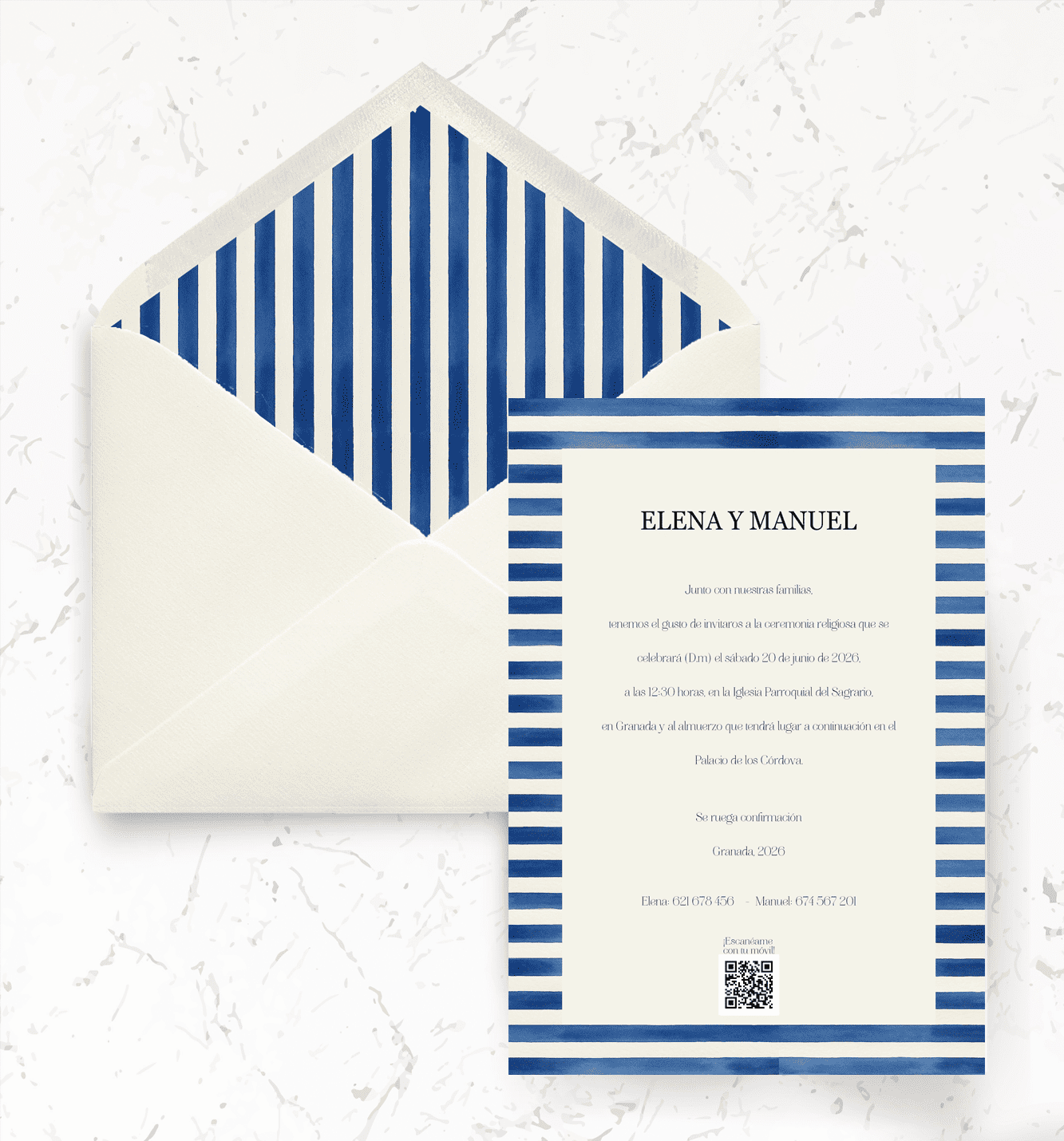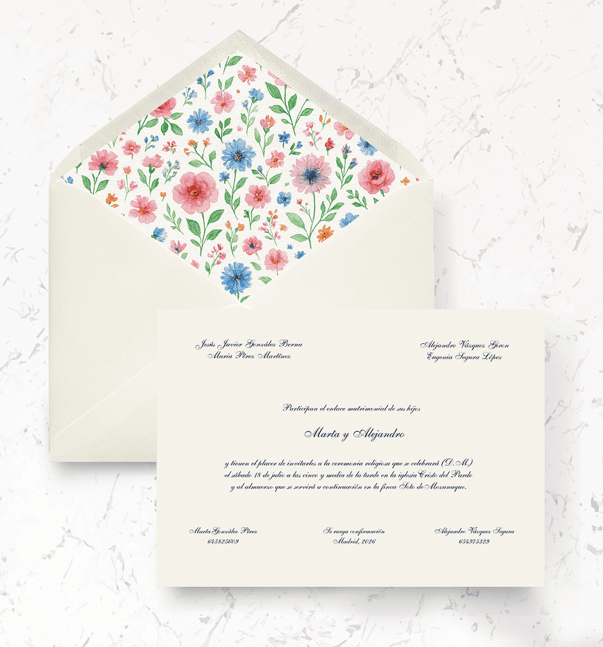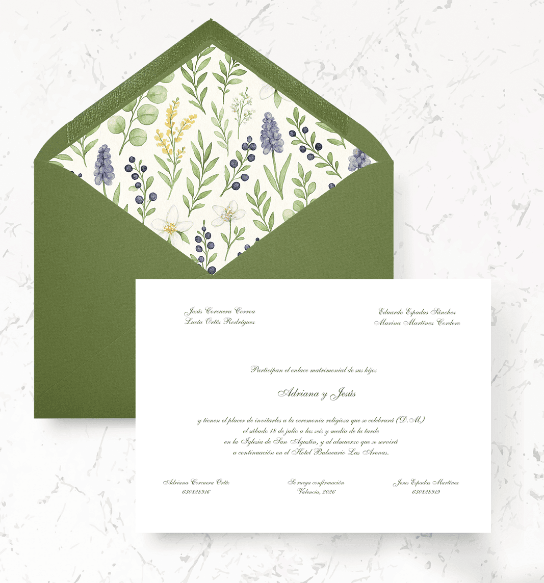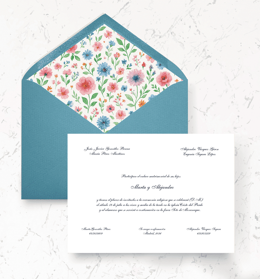 El lugar donde os casaréis también influye en el diseño de la invitación. No transmite lo mismo una boda junto al mar, con inspiración náutica y tonos suaves, que una celebración en un jardín rodeado de flores o en una finca con un aire rústico. Cada escenario tiene su propia magia, y queremos que vuestras invitaciones de boda en papel reflejen ese ambiente desde el primer vistazo. Por eso, trabajamos con vosotros para que cada detalle esté en sintonía con el lugar elegido.