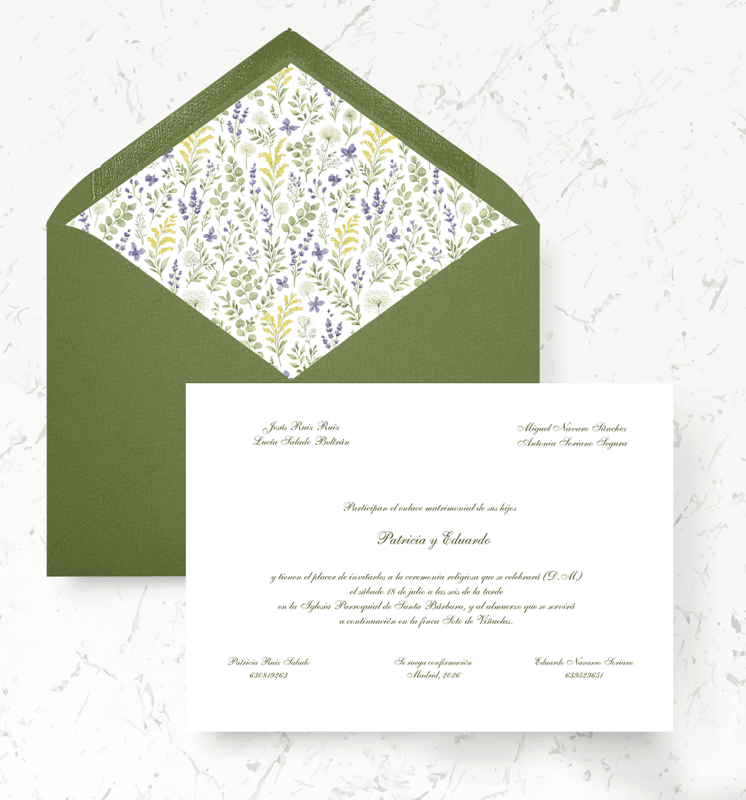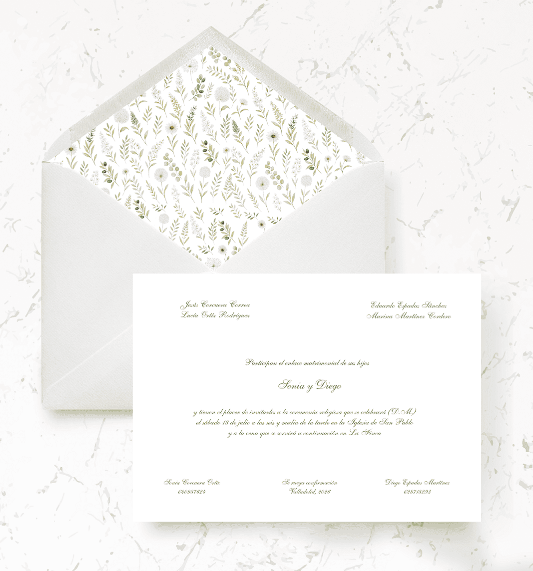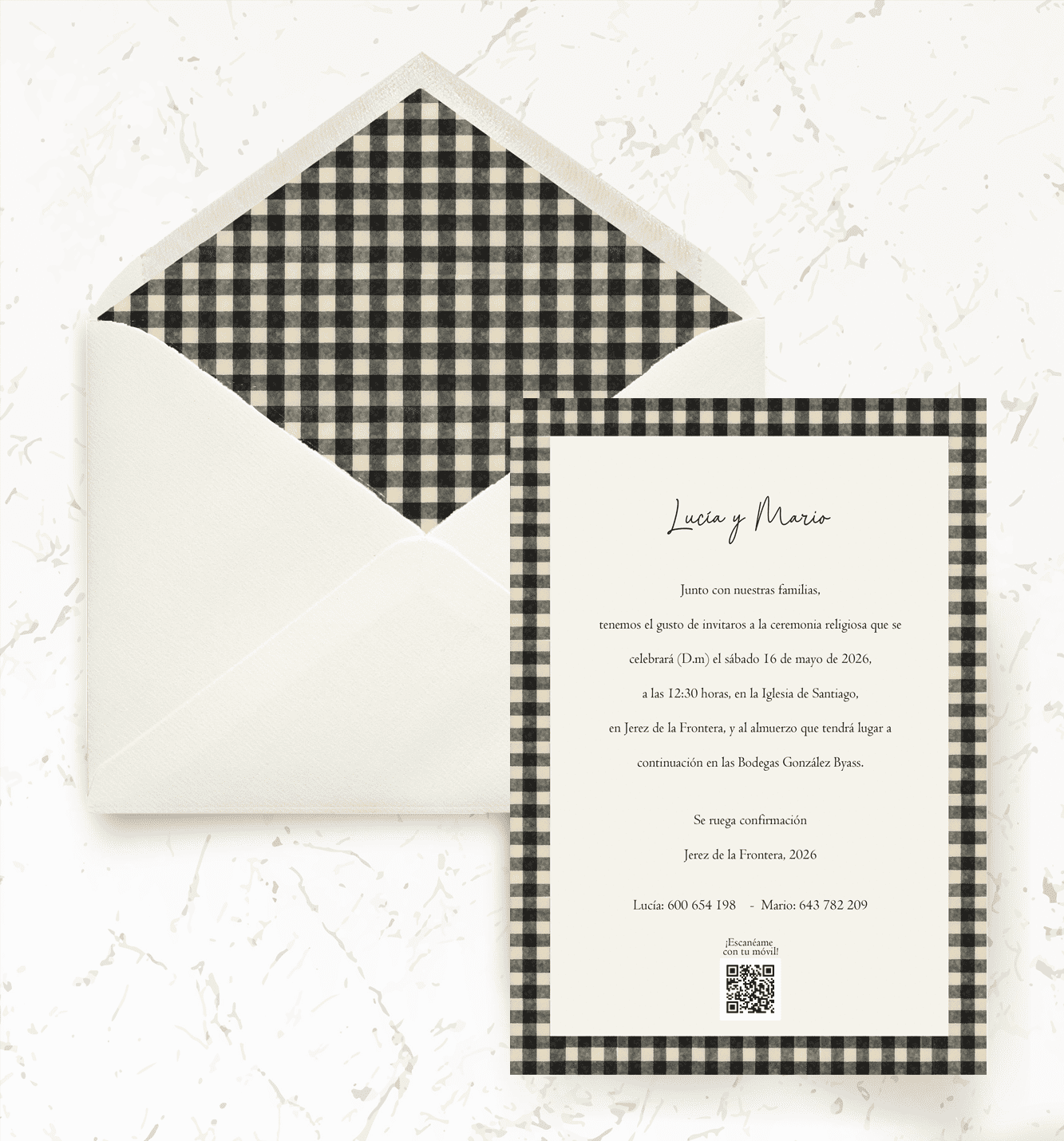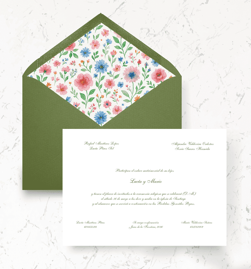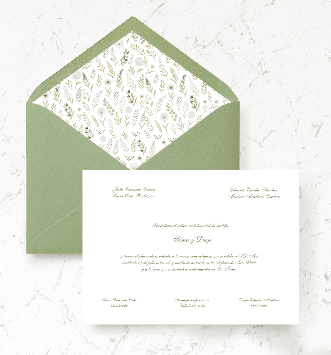 El lugar donde os casaréis también influye en el diseño de la invitación. No transmite lo mismo una boda junto al mar, con inspiración náutica y tonos suaves, que una celebración en un jardín rodeado de flores o en una finca con un aire rústico. Cada escenario tiene su propia magia, y queremos que vuestras invitaciones de boda en papel reflejen ese ambiente desde el primer vistazo. Por eso, trabajamos con vosotros para que cada detalle esté en sintonía con el lugar elegido.